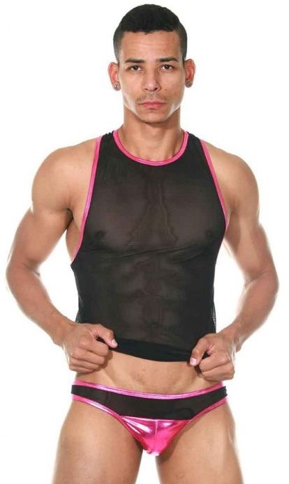 Интересный мужской комплект из майки и трусов-слипов. Майка-борцовка из полупрозрачного материала с контрастной окантовкой. Трусы-слипы из комбинации двух материалов: гладкого блестящего и полупрозрачного цвета. В комплекте: майка, трусы.