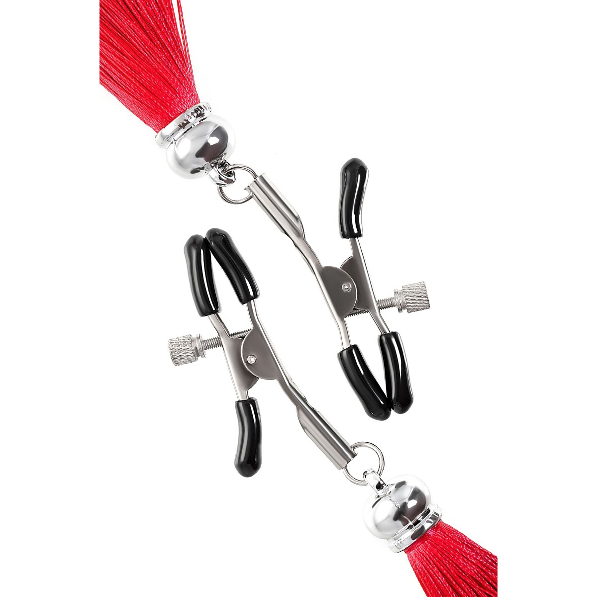 Хотите усилить ощущения от страстных игр с партнером? Увеличить степень возбуждения до невозможного можно с помощью зажимов-прищепок ручной работы от Рecado. Невероятно сексуальный аксессуар пробудит фантазию и повысит чувственность эротических зон. Мягкие резиновые накладки оберегают соски от повреждений. Металлический винт регулирует степень сжатия зажимов: от нежно-приятного до сильно-грубого. На концах черные резиновые наконечники, для безопасного воздействия на нежные участки тела. Компактный размер удобно вмещается как в женскую, так и в мужскую руку. Кисточки из натурального шелка не только визуально украшают эротический атрибут, но и еще утяжеляют его. Для самых смелых и искушенных любителей доминировать и подчиняться. Длина кисточки - 8,5 см.