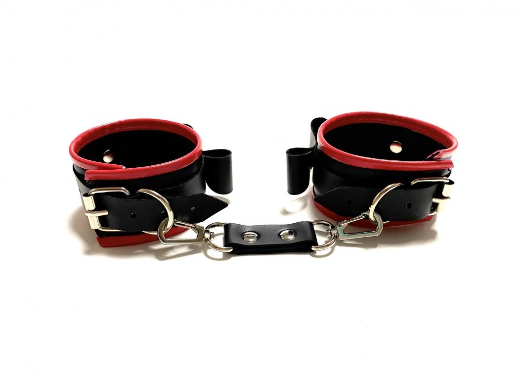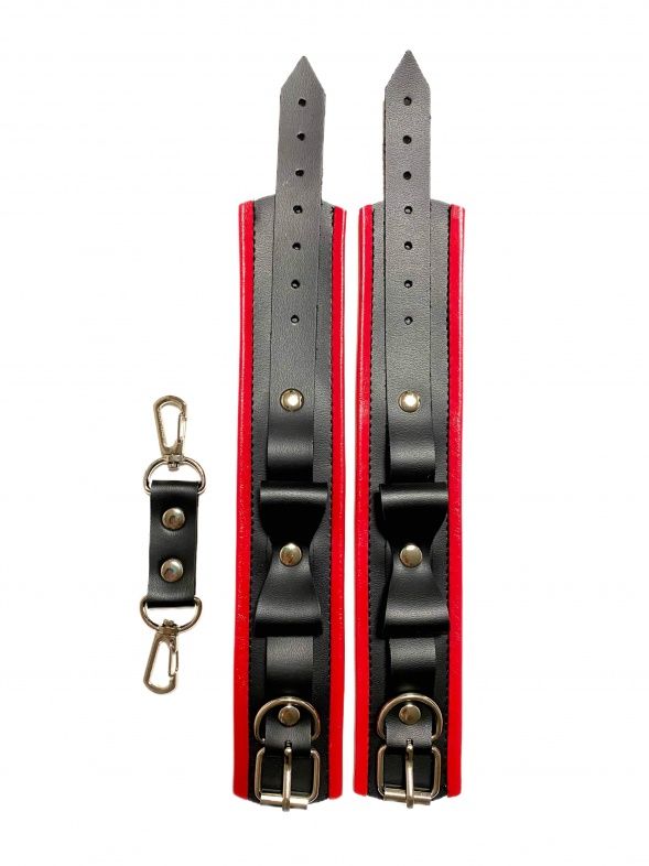 Красивые и функциональные наручники, выполненные из искусственной кожи. Декорированы металлической фурнитурой, лаковыми бантиками и красными вставками по краям. Обхват удобно регулируется с помощью пряжек. В комплекте идет соединение с карабинами. Очень экономичный, экологичный и практически незаменимый аксессуар для вашей любовной игры! Ширина - 4,5 см. Длина соединения - 11 см.