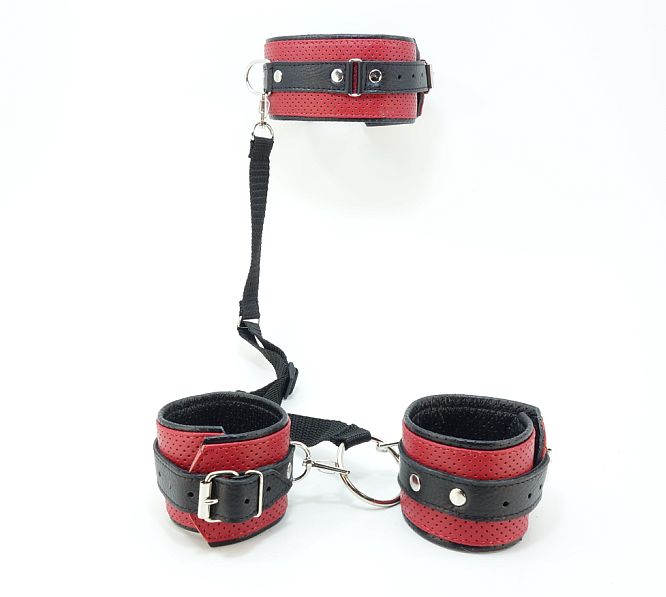 Великолепный бдсм-набор из ошейника и наручников, изготовленных из натуральной кожи. Размер ошейника, браслетов, ленты регулируются при помощи застежек. Длина ошейника - 43 см., ширина - 6 см. Длина оков - 25 см., ширина - 6 см.